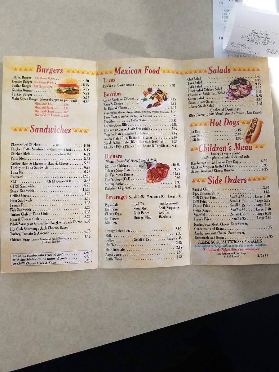 At lunch, Main Burgers shines with a variety of offerings, from classic Cheeseburgers to the refreshing Chicken Salad and savory Turkey Club Combo. Don't miss the Chili Cheese Fries for a delicious indulgence!