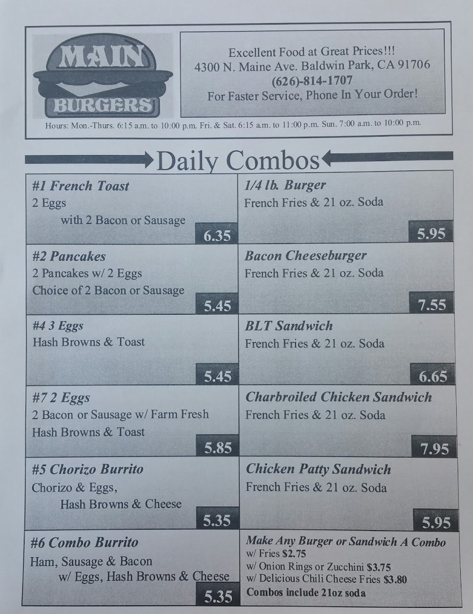 Located in Baldwin Park, Main Burgers is an American-style restaurant known for its diverse menu that caters to breakfast, lunch, and dinner enthusiasts. For breakfast, indulge in hearty options like Steak & Eggs or the delightful Huevos Rancheros. Their selection also features sweet treats like the #1 French Toast Special.